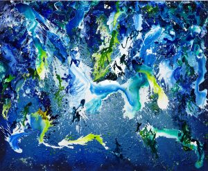 Although everything is painted by hand, the canvas or paper seems dampened by real droplets, and the boundaries between reality and imagination are blurred. The droplets posit water in its purest form or are complemented by expressive “splashes of color”, covering the layers below them in rivulets or with apparently spontaneous gestures. What looks coincidentally on the first sight actually is a deliberately created composition. Awe’s works play with the impressions created up close or at a distance, color contrasts, matte vs. lustrous layers, specific impact made on the space and capturing the moment.