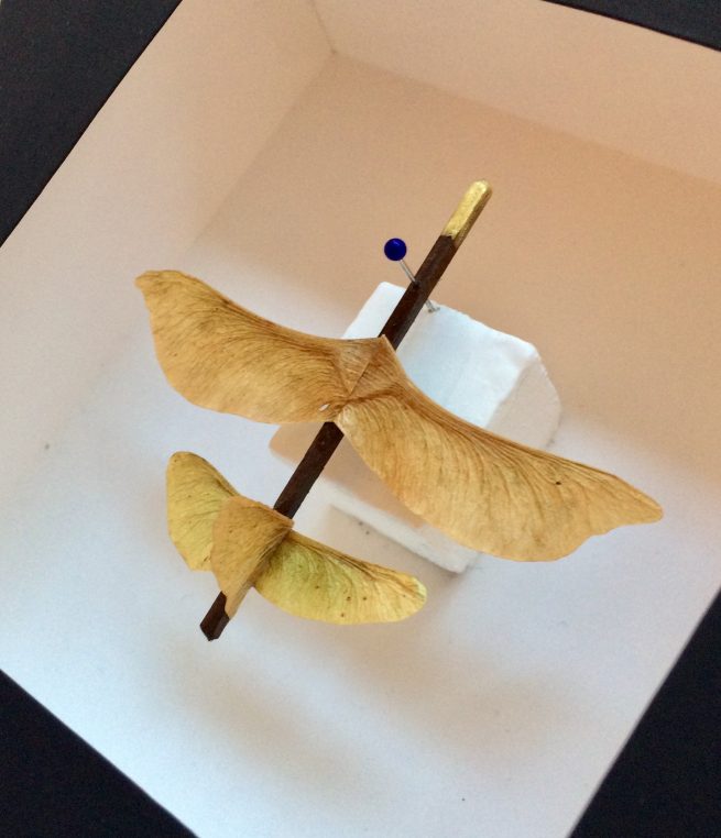 Oak seed pods, ebony, paint, foam, paper, metal pin