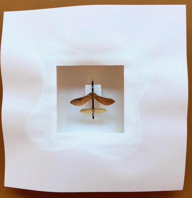 Oak seed pods, ebony, paint, foam, paper, metal pin