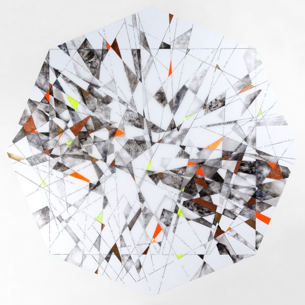 Indian ink, acrylic, brass, copper on polyester drafting film translucent matte