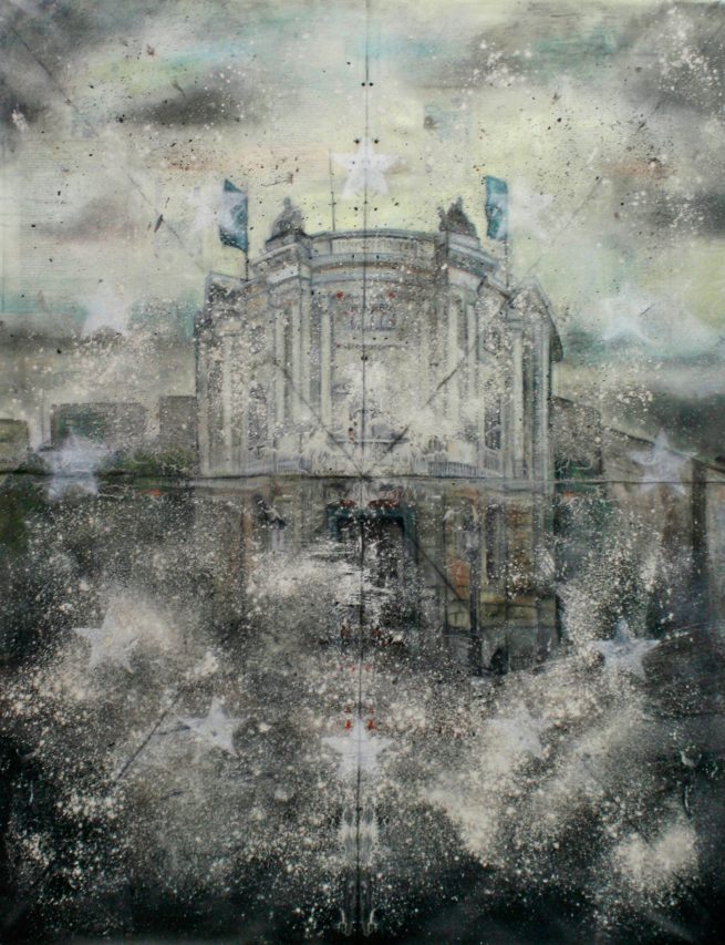 2016 Acrylic paint, spray paint, charcoal, collage and plaster. 170 x 130 cm