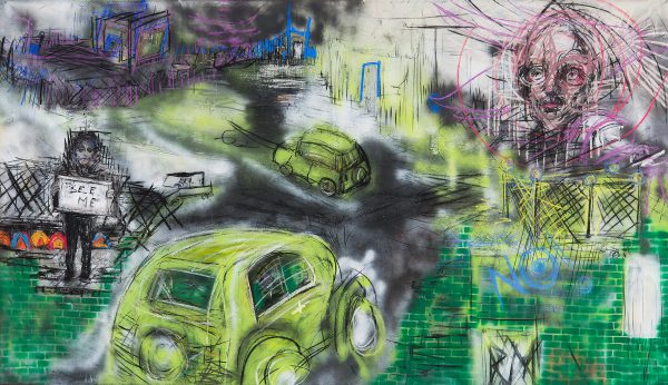 Charcoal, pastel, spray paint, acrylic, and oil on canvas
