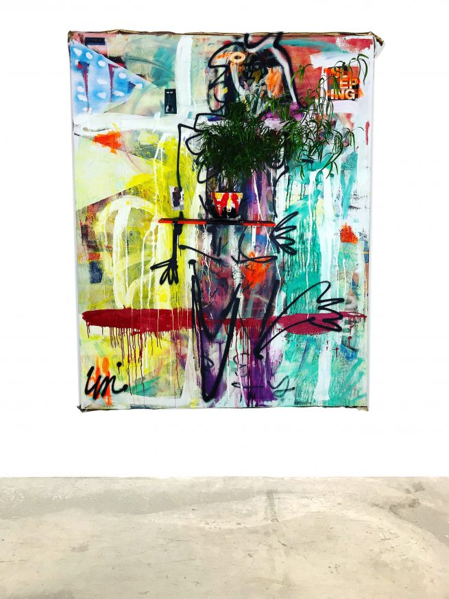 Acrylic, oil, wax, collage, aerosol, shelf on cotton mounted on wood frame