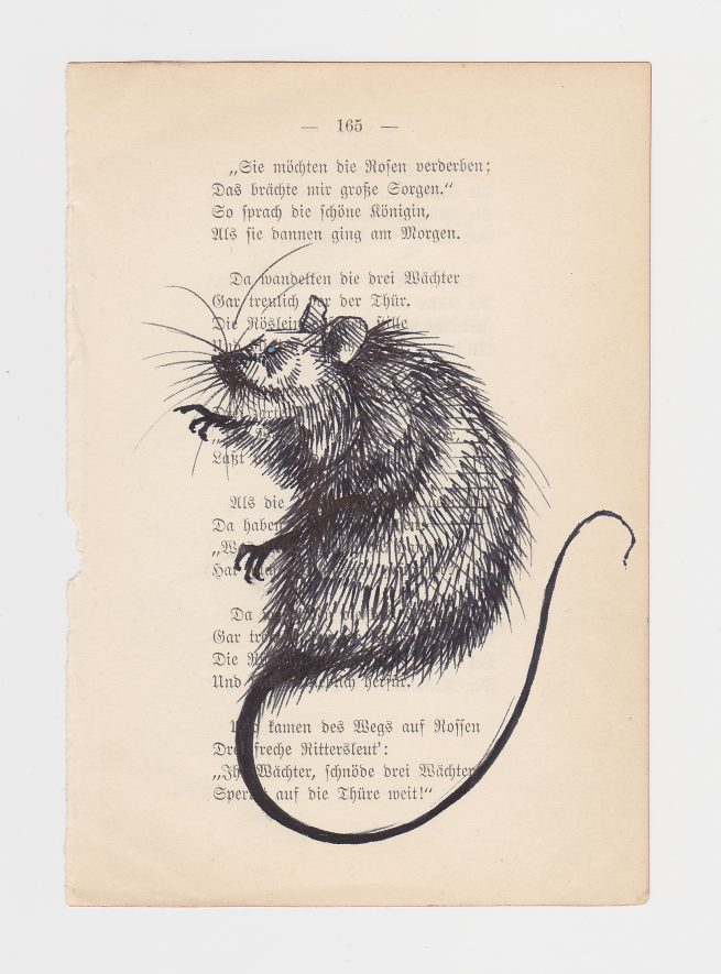 Blue posca pen on page from old poetry book “Uhlands Gedichte” 25,5 x 19,5 cm