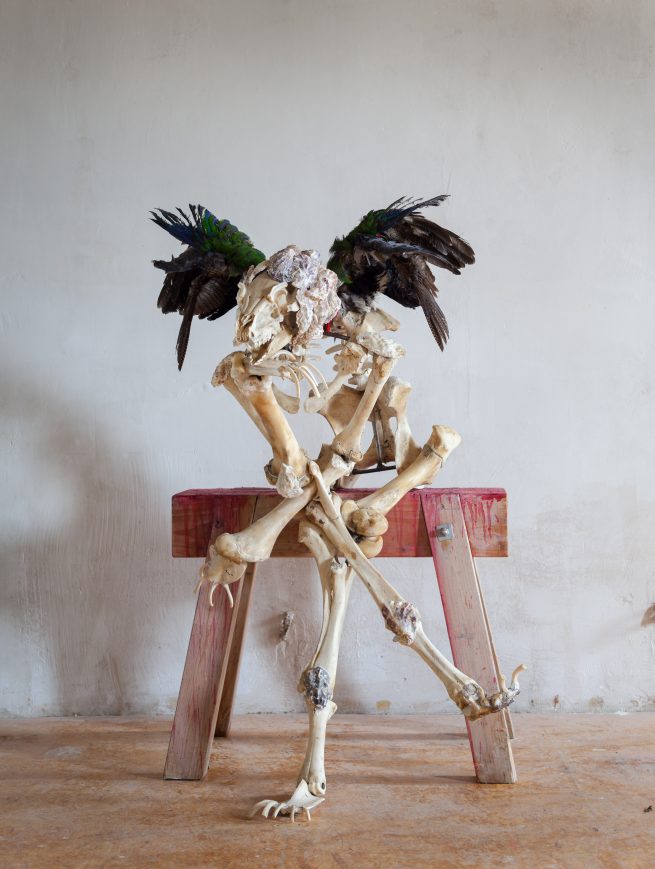 2014 Iron, bones, feathers, oysters, installation glue 143 x 110 x 110 cm