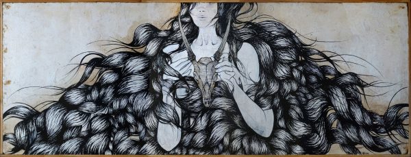 Shredded pages of old books, indian ink / white acrylic pen / pencil on wood 65 x 170 cm