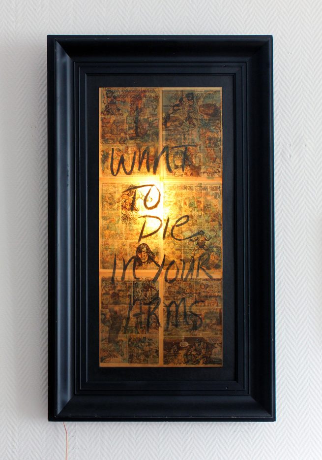 Mixed Media (resin, ink on comic book pages. Illuminated