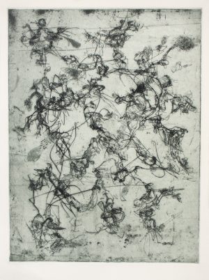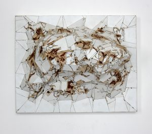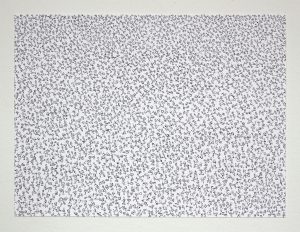 Alexander works with wood and paper. Basic elements of these materials are the lines: in one case they discern the physicality of the wood, in the other they run on the surface of the paper through Indian ink or incision. In both cases, the intertwining makes up an unquantifiable geometry as for example in a rectangular grid with a tortuous internal logic. At times one recognizes figures or parts of them rather like a wooden swing recalls the structure of branches but none of these associations of ideas is completely resolved. Nowhere will you find a natural or human image. It seems more likely that one may describe these works as material gestures, traces of gestures, evidence of a confrontation between the hand and the material. There is a dialogue between the artist and the media, because it is not simply there to “obey”. The artwork is rather the result of a study of the characteristics of the media and what it inspires in the artist through improvisation and using tools at hand to be used according to the changing emotional state of the artist.