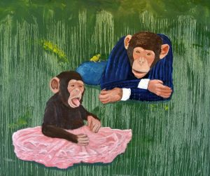 Besides the fact that they are funny and that it makes me happy to paint them, we have 99% the same DNA, but we are so different from each other, they live with the nature and we live off of it, but in some ways are we still similar, communicating with gestures and sounds, forming groups and hierarchies, it’s like describing a generational gap between us and our primal ancestors.