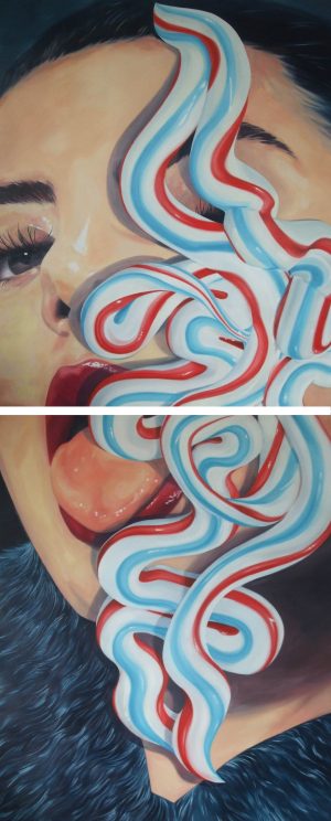 In her paintings Eva Citarrella focuses on figures or objects, mostly made of porcelain, which oscillate between cult and trash. These ironically distorted, sometimes shiny, sometimes dissolving figures, which are based on both the human and the animal form, often seem sentimentally distant and contrast with stylized forms that look like scribbles or fingerprints on a greasy touch screen. The painter breaks the traditional charm of these figures and their seemingly idyllic atmosphere and stages them in a new way. Combined with the color spectrum in the paintings, which ranges from screechy to candy-colored, complex pictorial spaces are created through multiple overlays.