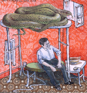 In each picture Roepke continually reinvents scenes for his tiny protagonists, the figures of which are drawn from 19th century Jiu Jitsu and 1970s yoga handbooks. Isolated in seemingly lonely domestic spaces, he throws them into ever changing and unexpected situations as if each work were a piece of iconographic research. The quotidian is turned on its head as the figures ward off monstrous animals, wild geometric figures and strange alien forms. Drawing upon art history, popular culture and the surrealist tradition, each piece is left open to a wealth of contextual interpretations.