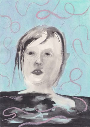 In her paintings and drawings she weaves a tight net of, as she puts it, “sweet and scary moments”, of obsessions, of recurring motifs which suggest that her work lends itself to be read like a story: the eye, the mirror, the circle, the mask, doubles, twins, animal hybrids.