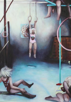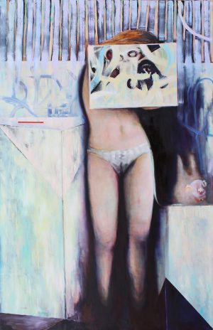 The seduction of Emeli Theander’s work lies in the peculiar way she combines the poetry of dreams and the marvel of children’s tales. It is figurative, in the sense that it is a setting for mysterious totemic figures at the cusp of fantasy and myth. In a cold, aquatic light, creatures- half-human, half-animal – from the Norse legends, strike a pose, watching us. Their pink flesh contrasts violently with the extraordinary shadowy masks they wear as disguises, a baroque mishmash of all kinds of animals, birds, rabbits, fish or wolves, between dreamlike superimposition and carnival madness.
