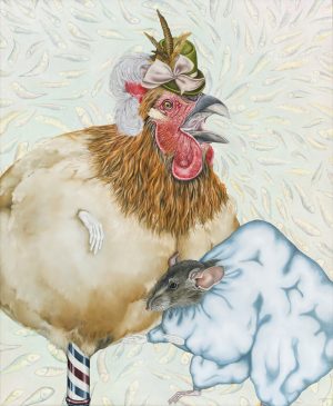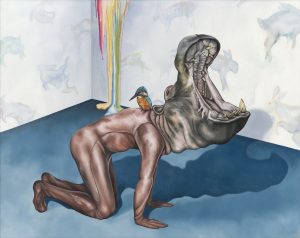 The strength of natures beauty is clearly captured through Doherty’s responsive use of colour and attention to detail. Physical instability surfaces within the work through an almost playful act, strongly pronounced with the use of metaphorical animal and bird heads morphed with human figures. The work not only crosses the line between natures creatures but also the line between the corporeal, ethereal, conscious and unconscious states of being. Dipping into this realm, in which representation and fantasy meld, this artist emerges with unsettling images of a fragile and rare beauty.
